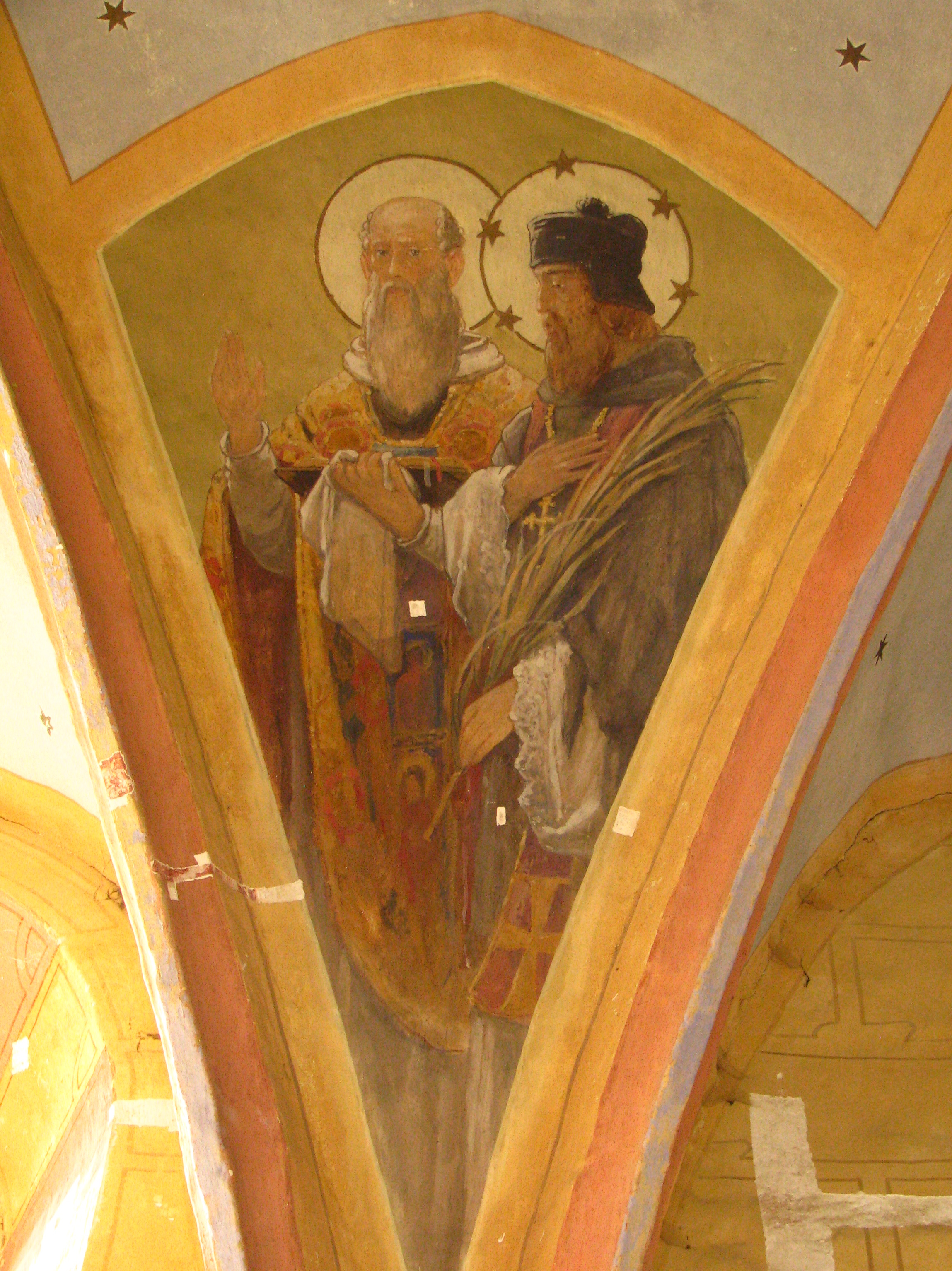 Mit Kircheninterieur sind farbige Fresken fest verbunden. Ältere Schicht der Fresken wurde teilweise bei der restauratorischen Forschung aufgedeckt (im Presbyterium geht es um ein Teil der gotischen Freske mit Motiv des gekreuzigten Christus; im Vorraum verschiedene heraldische Motive). Barockfresken decken ein Teil der Kirchenwände, aber Mehrheit der Wandfläche decken Jugendstillfresken aus Jahre 1907 – im Kirchenschiff gibt es stilisierte Ornamenten und im Presbyterium Figuralmotive (die Heilige Dreifaltigkeit ist mit tschechischen Heiligen und Patronen umringt).